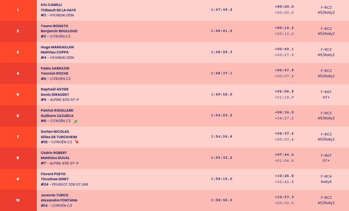 Bien que le leader du championnat lâche un peu plus de temps à Camilli, Bonato est bien le seul à être dans le rythme du Niçois, puisque Hugo Margaillan et Pablo Sarrazin sont désormais relégués à plus de 40 secondes, même Sarrazin s'offre tout de même le deuxième meilleur temps juste derrière Camilli dans l'ES10.