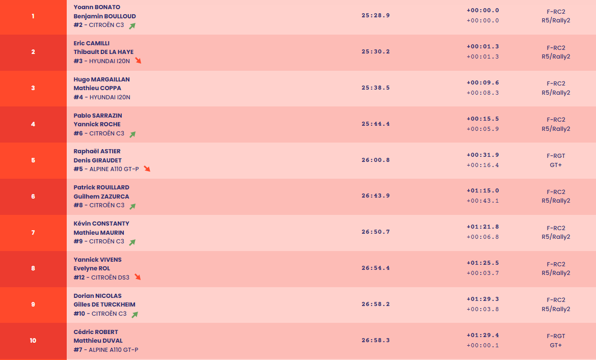 Départ sur les chapeaux de roues pour les principaux animateurs du CFR cette saison ! Après trois spéciales disputées cette après-midi, c'est donc ce trio Bonato - Camilli - Margaillan qui se détache en tête du classement, à l'avantage de Yoann Bonato pour le moment. Vainqueur de la première spéciale, Eric Camilli a d'abord pris les commandes de la course avant de voir Yoann Bonato passer en tête à l'issue de la troisième spéciale. Avant d'attaquer la boucle nocturne à partir de 19 heures, c'est donc le leader du championnat qui mène pour 1,3 seconde. Troisième en embuscade à 9,6 secondes, Hugo Margaillan tient le rythme mais doit surveiller Pablo Sarrazin qui n'a pas encore été complètement décroché par le podium. Derrière les écarts sont déjà plus conséquents avec Raphaël Astier cinquième à 31 secondes et puis Patrick Rouillard sixième au-delà de la minute d'écart.