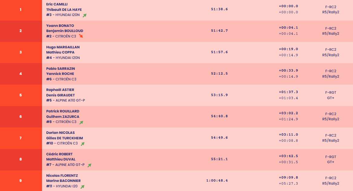 Deuxième juste derrière Yoann Bonato après la première boucle cette après-midi, Eric Camilli frappe fort dans la boucle du soir et particulièrement dans la dernière spéciale pour prendre les commandes du rallye devant Yoann Bonato. Derrière le duo de tête, Hugo Margaillan est cette fois-ci lâché.