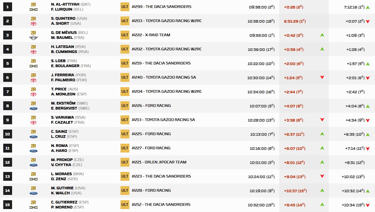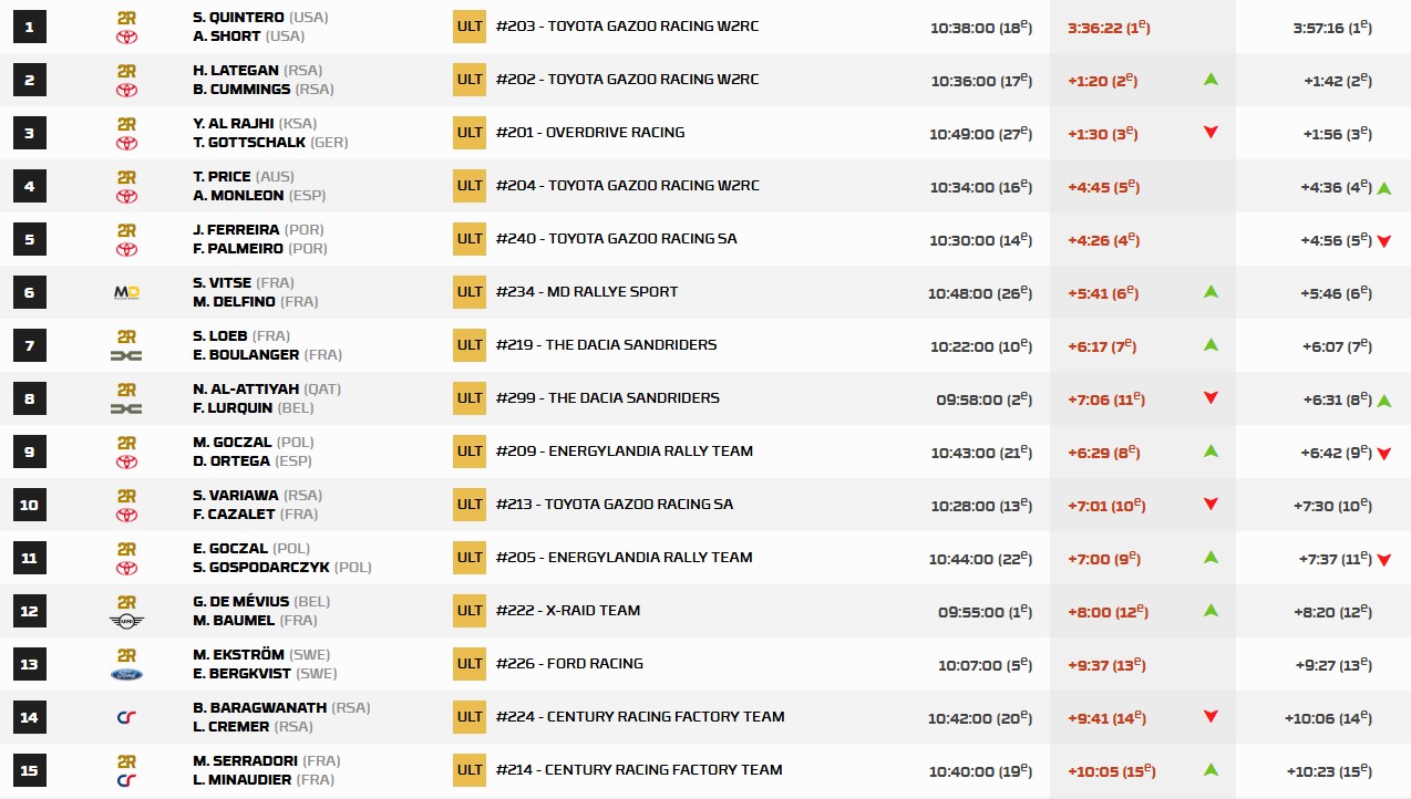 Alors que certains concurrents ont déjà franchi le kilomètre 300, la bataille fait rage derrière. Au passage du km 240, le classement révèle un monopole écrasant de Toyota : Seth Quintero mène devant Yazeed Al Rajhi (+2’00"), Saood Variawa (+2’18"), Henk Lategan (+2’42"), Toby Price (+3’27") et Joao Ferreira (+3’48"). Même Eryk Goczal, 9ᵉ à +6’31", aligne un septième Hilux dans le top 10. Après les victoires de Ford (prologue) et X-Raid Mini (étape 1), Toyota prend sa revanche en force !