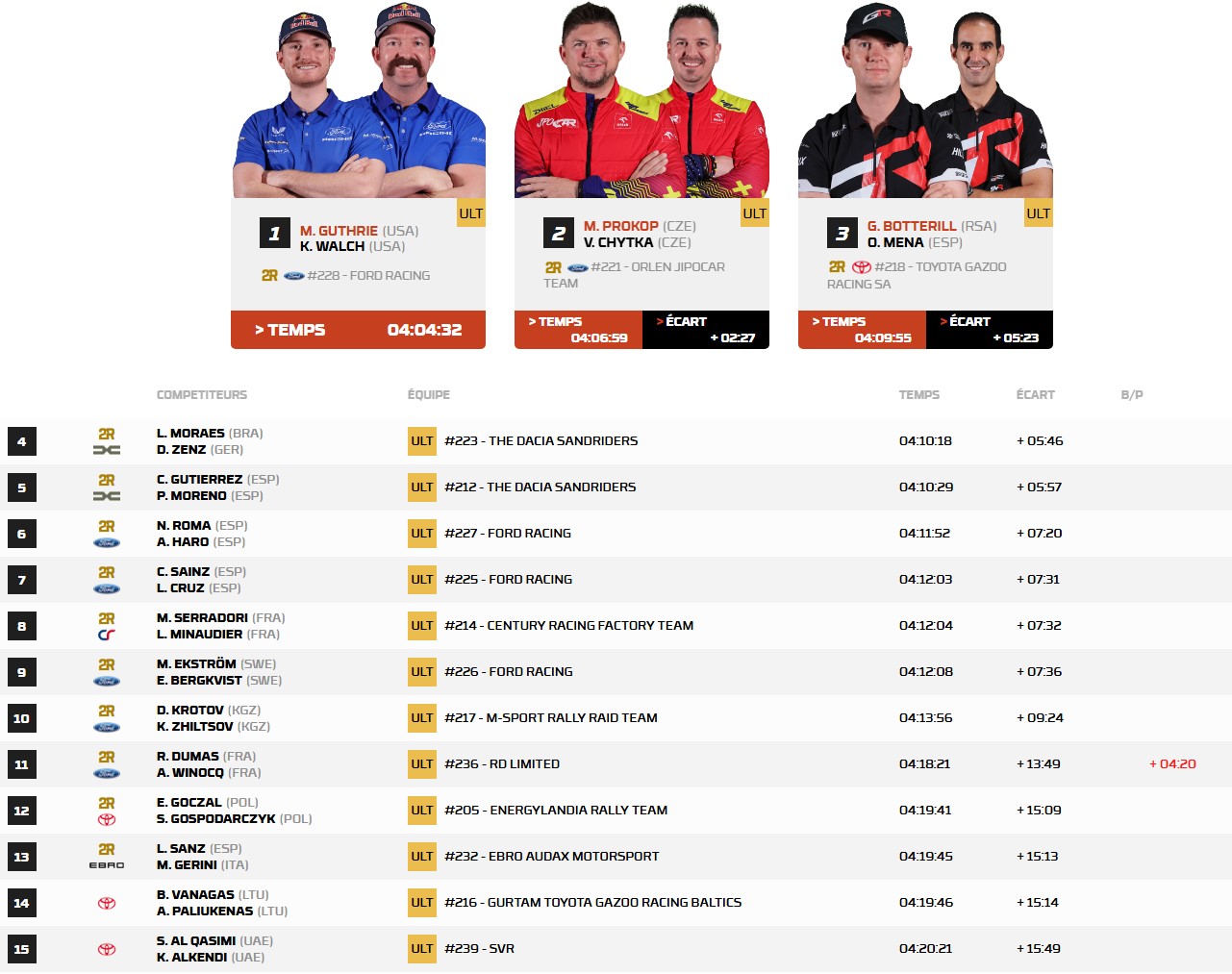 Sébastien Loeb, victime de deux crevaisons et sans roue de secours, termine à +16'56", chutant à la 12e place du général. Seth Quintero, leader hier, s’est immobilisé plusieurs minutes au km 275, avant de repartir avec un retard de 19'28" sur Ekström. Avec deux victoires américaines en deux jours, une domination écrasante de Ford, et des favoris en difficulté, cette édition prouve que rien n’est jamais joué avant l’arrivée. Mitch Guthrie s’installe en leader, mais la course reste plus ouverte que jamais !