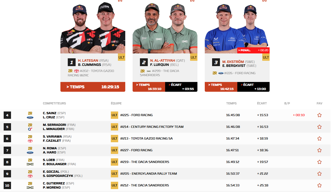 Henk Lategan était sur une autre planète ce matin ! Jusqu'à présent discret mais relativement bien placé au classement général, le Sud-Africain livre aujourd'hui une performance monumentale à l'occasion de la première partie de cette étape marathon. Parti en douzième position ce matin, Lategan s'empare des commandes de la course dès le kilomètre 89. D'abord au coude à coude avec les Dacia de Loeb et Al-Attiyah, le pilote Toyota s'envole en milieu d'étape, portant l'écart jusqu'à plus de huit minutes ! Intouchable et sur un petit nuage, Lategan remporte l'étape avec une avance colossale de 7 minutes, le propulsant par la même occasion à la 1ʳᵉ place du classement général avec plus de trois minutes d'avance.