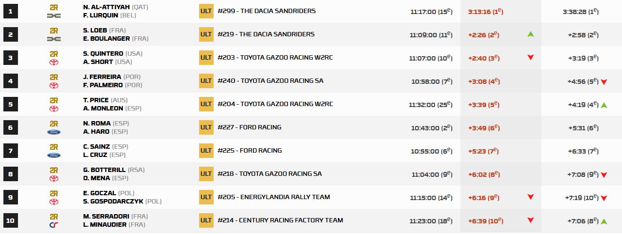 Parti en lion, Sébastien Loeb a confirmé sa remontée fulgurante. Huitième au km 162, le Français a grimpé jusqu’à la deuxième place à l’arrivée, offrant à Dacia un doublé historique, une première pour la marque sur le Dakar. Un an après avoir remporté sa première étape, le constructeur roumain s’impose désormais comme une force majeure de l’épreuve. Seth Quintero, longtemps en lice pour la victoire, a finalement dû s’incliner, terminant à plus de deux minutes et quarante-huit secondes d’Al Attiyah. Toby Price, en pleine ascension depuis le matin, a perdu du terrain dans les derniers kilomètres, glissant à la cinquième place.