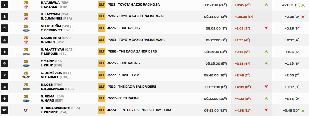 Nasser Al Attiyah perd pied au km 414 : le Qatarien, jusqu’alors en embuscade, lâche près de 2 minutes sur Henk Lategan et dégringole à la 5e place provisoire. Le Sud-Africain peut enfin respirer, mais Mattias Ekström reste aux aguets, pointé à 49 secondes. Seth Quintero en profite pour s’emparer de la troisième place, compliquant un peu plus la donne. Au dernier pointage (km 448), Henk Lategan confirme sa domination : il creuse un écart de 1 minute et 3 secondes sur Ekström, assurant sa position de leader. Quintero (3e, +1’35’’) et Al Attiyah (4e, +2’11’’) ferment la marche, mais la victoire semble désormais à portée de main pour le Sud-Africain.