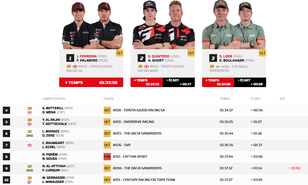 Derrière Seth Quintero, deuxième, c'est Sébastien Loeb qui complète le podium. Pas toujours dans le coup sur cette spéciale, l'Alsacien a augmenté le rythme en fin de spéciale pour finir fort et accrocher le podium, ce qui prive Toyota de signer un top 4.