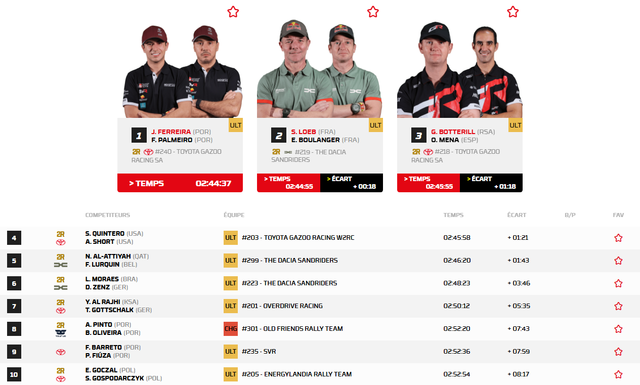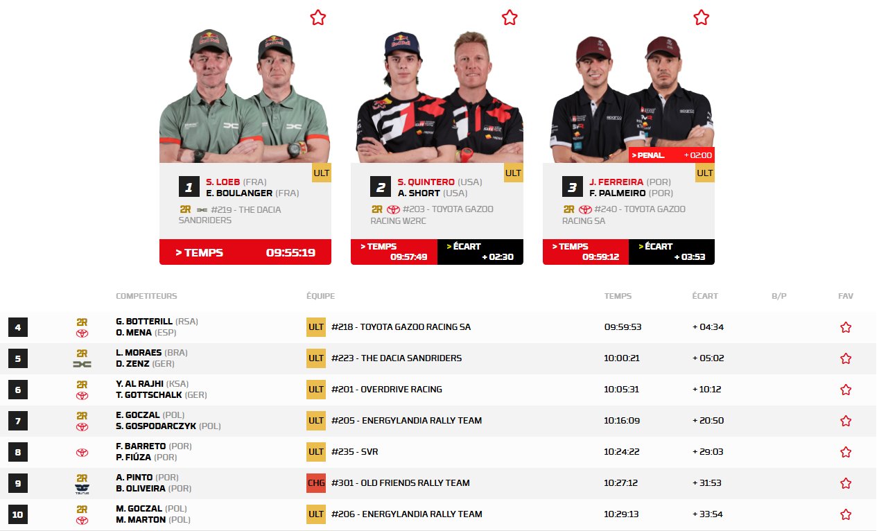 Deuxième du jour comme lors de l'étape d'hier, Sébastien Loeb joue une partition parfaite pour le moment puisque l'Alsacien score de gros points et en profite même pour augmenter son avance en tête de la course puisqu'il parvient à nouveau à devancer Seth Quintero. Dacia place également les deux autres Sandriders dans le top 6 grâce à Nasser Al-Attiyah cinquième et Lucas Moraes sixième. En l'absence des Ford retirées de la course, le duel Dacia contre Toyota est animé en cette fin de course !