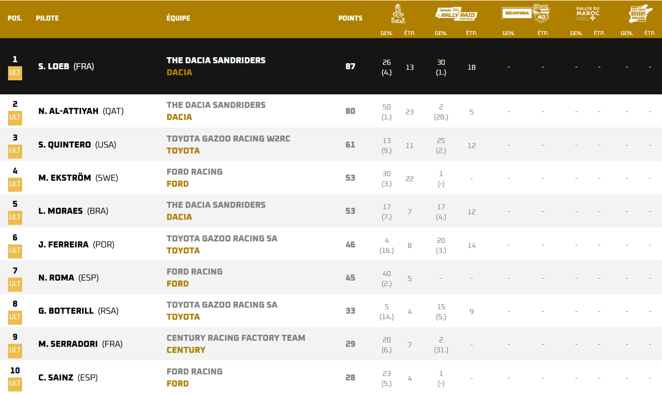 Grand vainqueur de cette deuxième manche et vainqueur de la deuxième spéciale avec en bonus, deux autres arrivées sur le podium d'une étape, Sébastien Loeb repart du Portugal les poches pleines. Frustré après un Dakar qui ne lui aura pas souri, l'Alsacien retrouve le sourire après cette deuxième manche… et bascule en tête du championnat. Avec 48 points encaissées sur cette deuxième manche, Loeb bascule immédiatement en tête du championnat pour sept points devant son coéquipier Nasser Al-Attiyah. De son côté, le vainqueur du Dakar aura lui vécu une escapade Portugaise plus compliquée avec seulement 7 points à se mettre sous la dent. Côté Dacia, Lucas Moraes effectue lui aussi une belle remontée. Seulement huitième avec 24 points après le Dakar, le Brésilien tenant du titre mondial remonte à la cinquième position en scorant presque le double des points empochés en Arabie Saoudite.