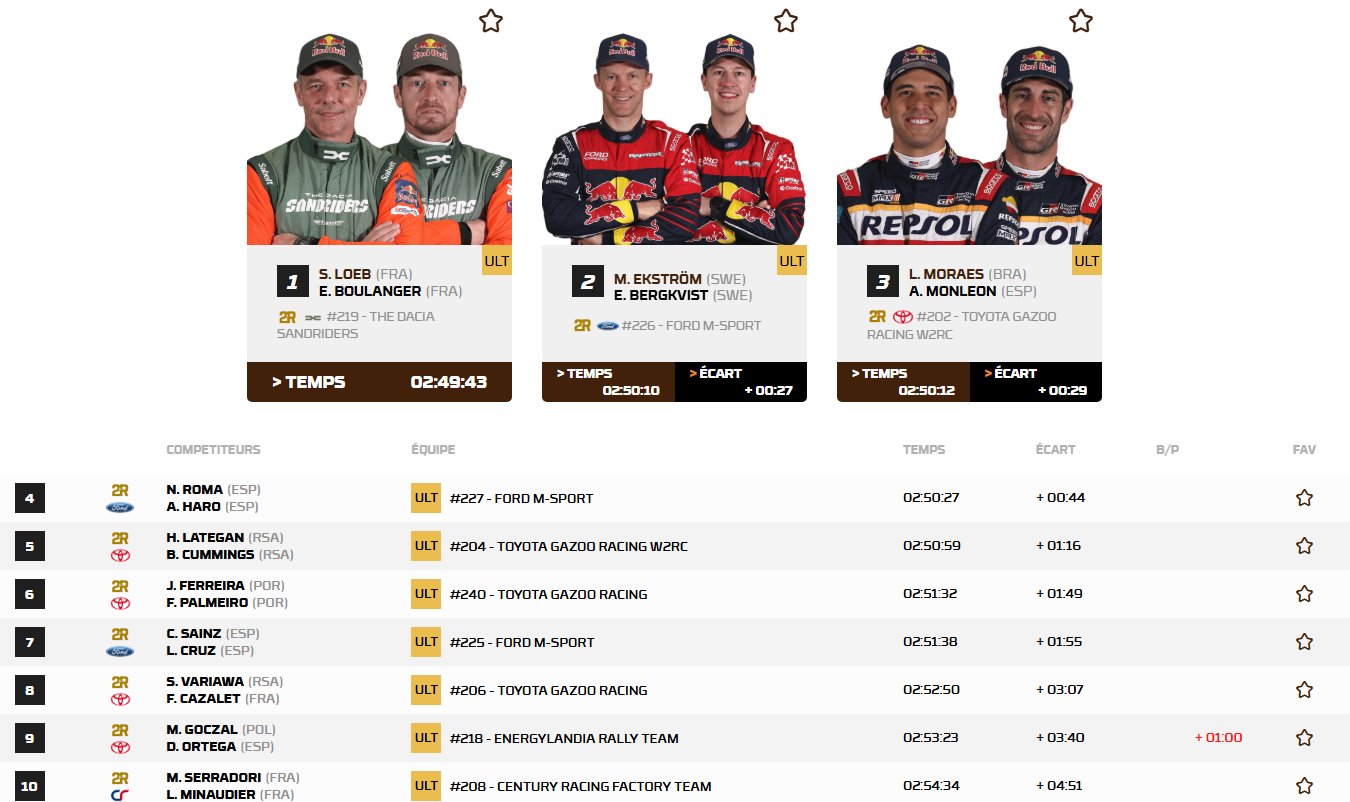 En retrait depuis plusieurs manches avec des performances souvent non abouties, Ford frappe très fort sur cette première étape en plaçant trois des quatre Raptors dans le top 10 avec donc Ekström deuxième, puis Nani Roma quatrième et Carlos Sainz septième. Mathieu Serradori fait son apparition dans un top largement dominé par Toyota, en dehors donc de Sébastien Loeb ainsi que des trois Ford.