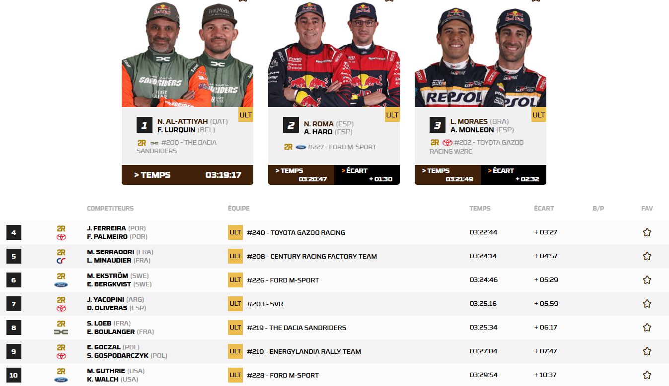 Deuxième jour de course au Maroc et au programme du jour pour cette deuxième étape, 306 kilomètres dans une boucle autour de Erfoud. Après la victoire de Sébastien Loeb hier, Dacia double la mise grâce à Nasser Al-Attiyah qui corrige le tir après sa difficile première étape hier. Lucas Moraes maintient son rythme, mais son coéquipier Henk Lategan dit peut-être adieu au titre ce soir après une journée compliquée. Une nouvelle fois bien placé, Nani Roma bascule en tête de la course.