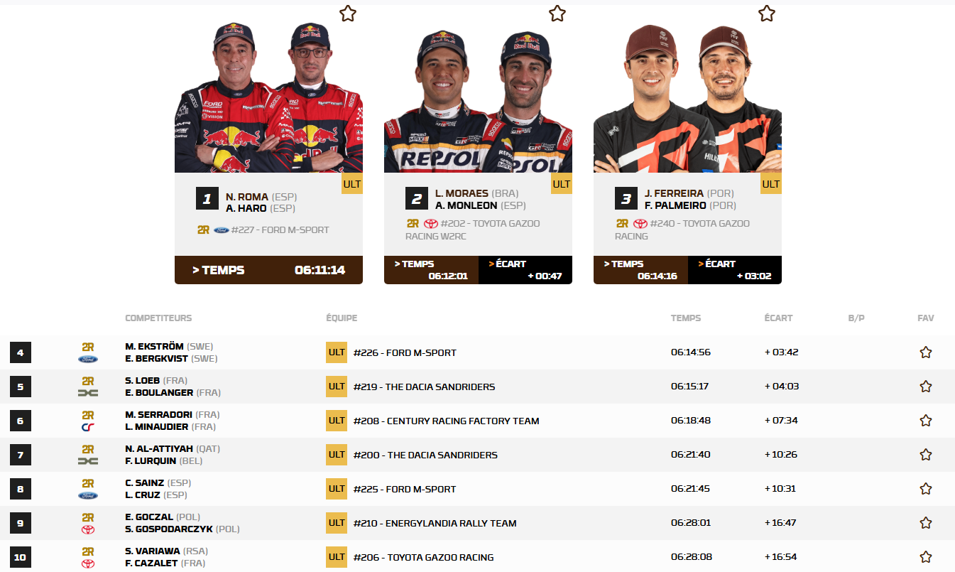 Déjà sur le podium hier, Nani Roma réalise la meilleure opération du jour puisque l'Espagnol s'empare des commandes du classement général. Lui aussi sur le podium de la première étape hier, Lucas Moraes signe un nouveau finish dans le top 3 et doit désormais prendre en chasse Nani Roma. Au championnat, Nasser Al-Attiyah se donne un peu d'air grâce à sa victoire, mais Moraes maintient la pression. Vainqueur et leader du général hier soir, Sébastien Loeb négocie bien une deuxième étape qu'il devait ouvrir en terminant huitième et en se maintenant à la cinquième place du général malgré une crevaison en cours de spéciale.