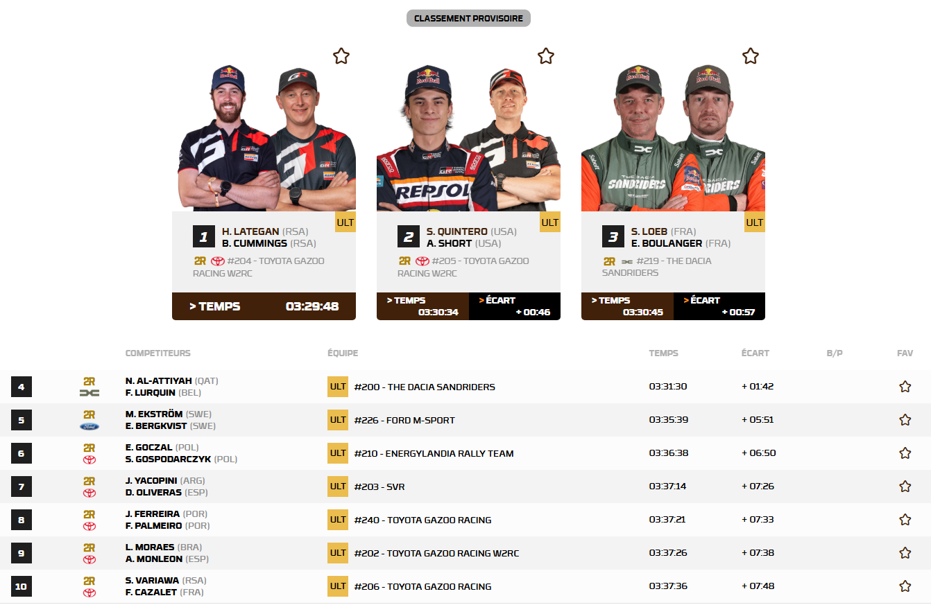 Au lendemain d'une journée catastrophique qui lui aura vu concéder plus d'une heure au classement général, Henk Lategan s'impose à l'issue de cette troisième étape. Parti de la 20ᵉ position, le Sud-Africain n'avait plus le choix que d'attaquer après la journée cauchemardesque de la veille. Si le pilote Toyota n'est pas officiellement hors course pour le titre car tout peut encore arriver sur le papier, il est évident qu'à la régulière, Lategan a laissé s'envoler tout espoir de titre dans ses mésaventures hier. Pour l'honneur, le Sud-Africain continue donc d'attaquer et est allé chercher cette troisième étape à la force du poignet. Comme hier, ils étaient nombreux à se partager les commandes de l'étape ! Cette fois-ci, c'était une bataille à trois entre Loeb, Ekström et Lategan, une bataille qui aura finalement tourné à l'avantage de Lategan dans les derniers kilomètres de l'étape. Le Sud-Africain s'impose avec 46 secondes d'avance sur son coéquipier Quintero et Sébastien Loeb complète le podium. Leader après la première étape, l'Alsacien retrouve les commandes de la course ce soir.