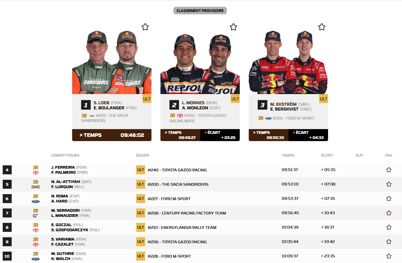 Côté championnat, Nasser Al-Attiyah et Lucas Moraes se neutralisent. Quatrième du jour, le Qatari reprend du temps au classement général et se donne un peu d'air sur Lucas Moraes. Toujours deuxième du général à seulement trois minutes de Sébastien Loeb, le Brésilien a encore deux étapes pour faire plier le triple champion du monde en titre.