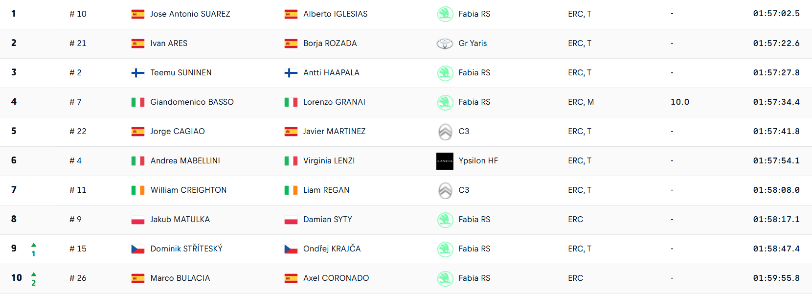 Derrière, Andrea Mabellini accroche la sixième position pour ses débuts Européens avec la nouvelle Lancia Ypsilon Rally2, suivi par William Creighton. L'Irlandais fraîchement débarqué de son championnat national impressionne pour ses débuts au plus haut niveau Européen. En difficulté ce week-end, Erik Cais et Simone Tempestini que l'on a souvent l'habitude de voir dans le top 10 doivent ce week-end se contenter de la 14ᵉ et de la 15ᵉ place.