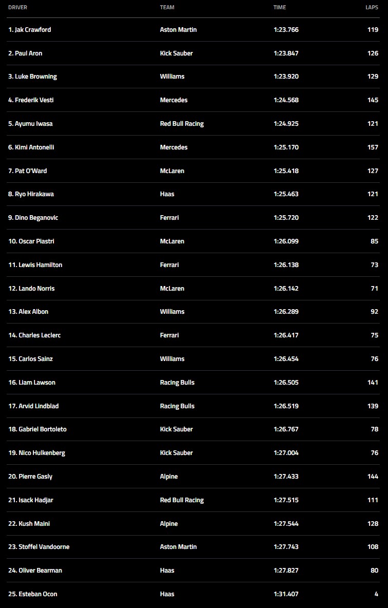 Browning place la Williams au troisième rang, après avoir déjà participé à plusieurs séances de Libres 1 plus tôt dans la saison. Juste derrière, Frederik Vesti (réserviste Mercedes) accroche la quatrième place avec 145 tours réalisés, tandis qu’Ayumu Iwasa positionne la Red Bull en cinquième position. Antonelli, O’Ward et Hirakawa complètent le top 8, suivis par le pilote F2 Dino Beganovic, neuvième pour Ferrari, et Oscar Piastri qui ferme la marche du top 10.
