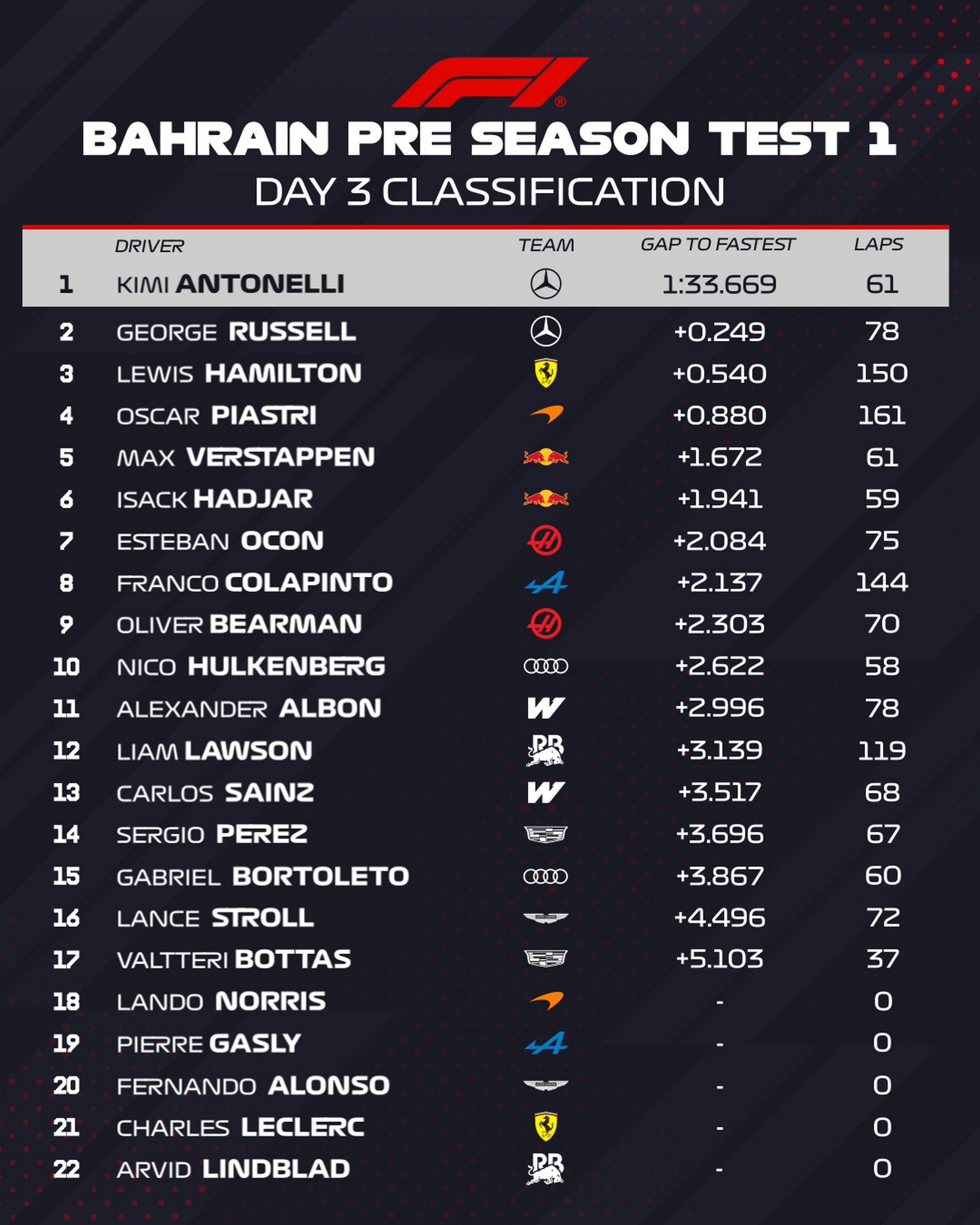 Le rideau est tombé sur la première salve d'essais hivernaux à Bahreïn, et le ciel du désert s'est teinté d'argent. Pour cette ultime journée de tests, Mercedes a frappé un grand coup en s'offrant un doublé autoritaire au sommet de la hiérarchie, envoyant un message clair à la concurrence pour l'aube de cette saison 2026.