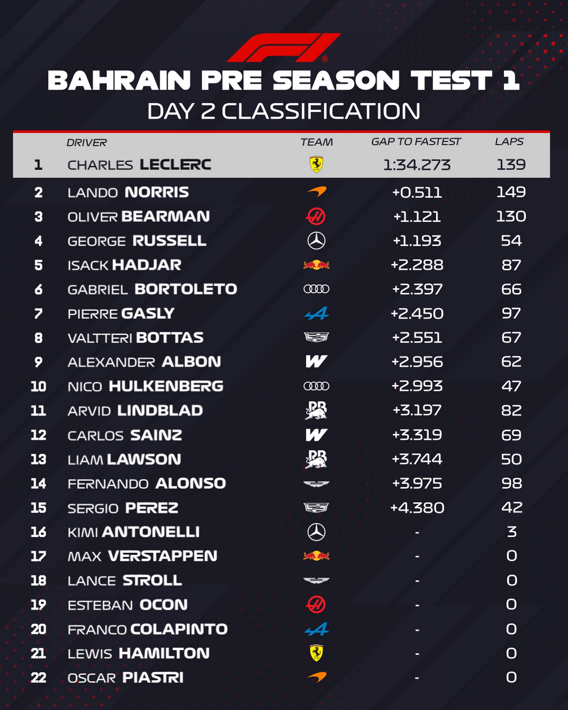 Charles Leclerc a dominé la deuxième journée d’essais à Bahreïn, menant la danse devant Lando Norris et Ollie Bearman alors que la pré‑saison poursuivait son crescendo sous le soleil brûlant puis les lumières du désert.