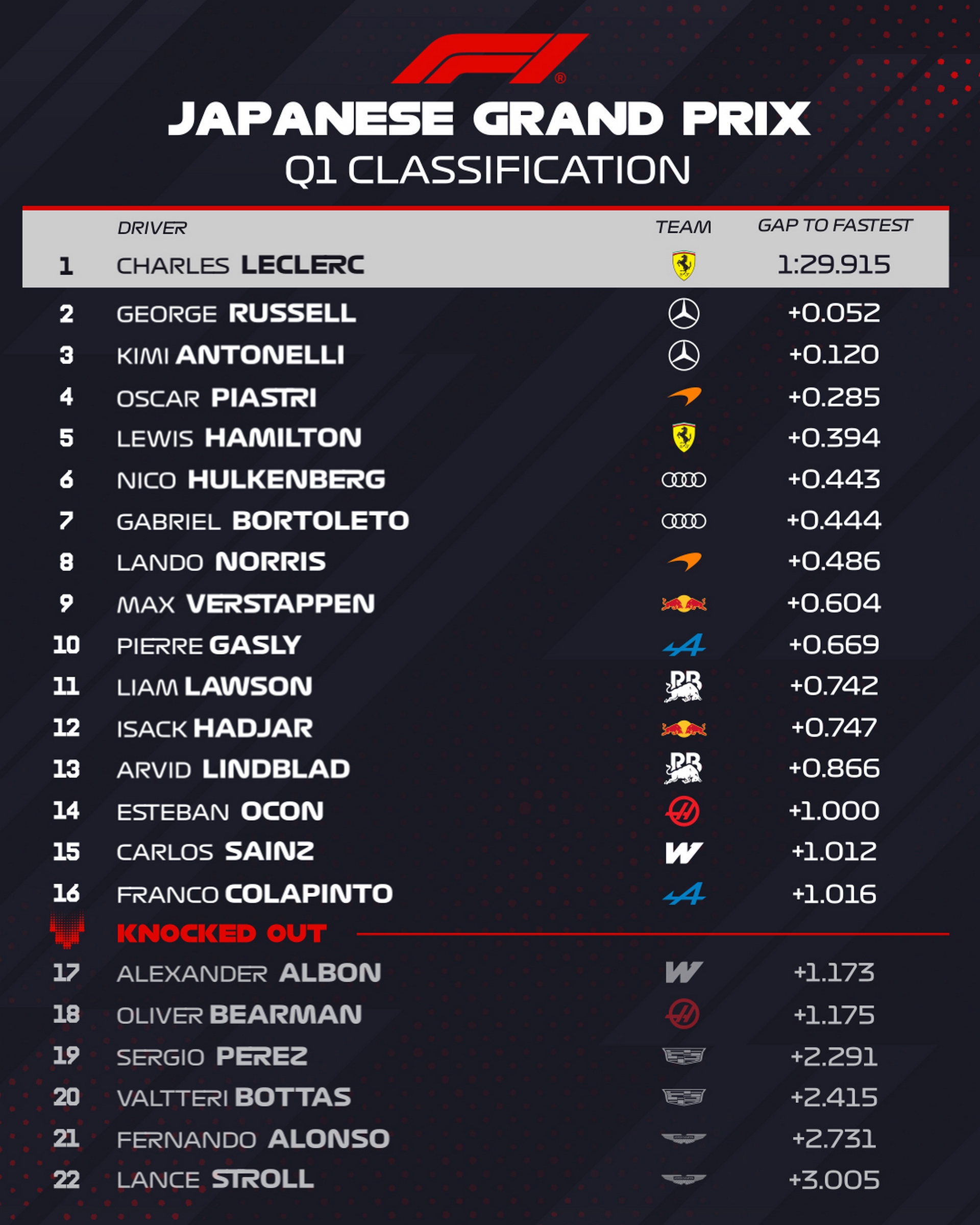 Les éliminés sont : Albon, Bearman, Pérez, Bottas, Alonso et Stroll.