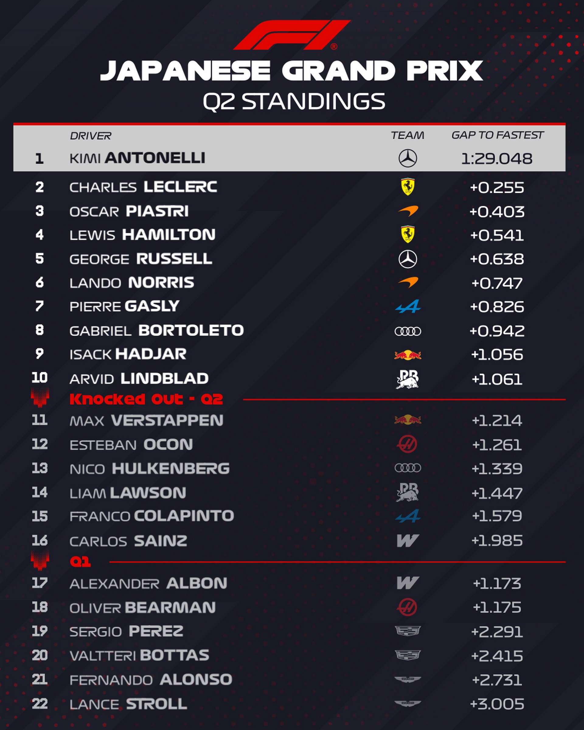 Antonelli entame son ultime tentative, Russell est légèrement plus rapide que l'Italien, les Mercedes sont favorites pour la première ligne. Antonelli en termine avec son tour, il n'améliore pas son chrono, Russell non plus, Norris ne fait pas mieux, tout comme Piastri, les 4 premières places restent figées, Leclerc s'était adjugé le record du premier secteur, le Monégasque va couper la ligne avec le 4e chrono en 1'29"405, sa dérobade dans le virage Spoon lui coûte cher. Hamilton est 6e devant Gasly, Hadjar, Bortoleto et Lindblad.