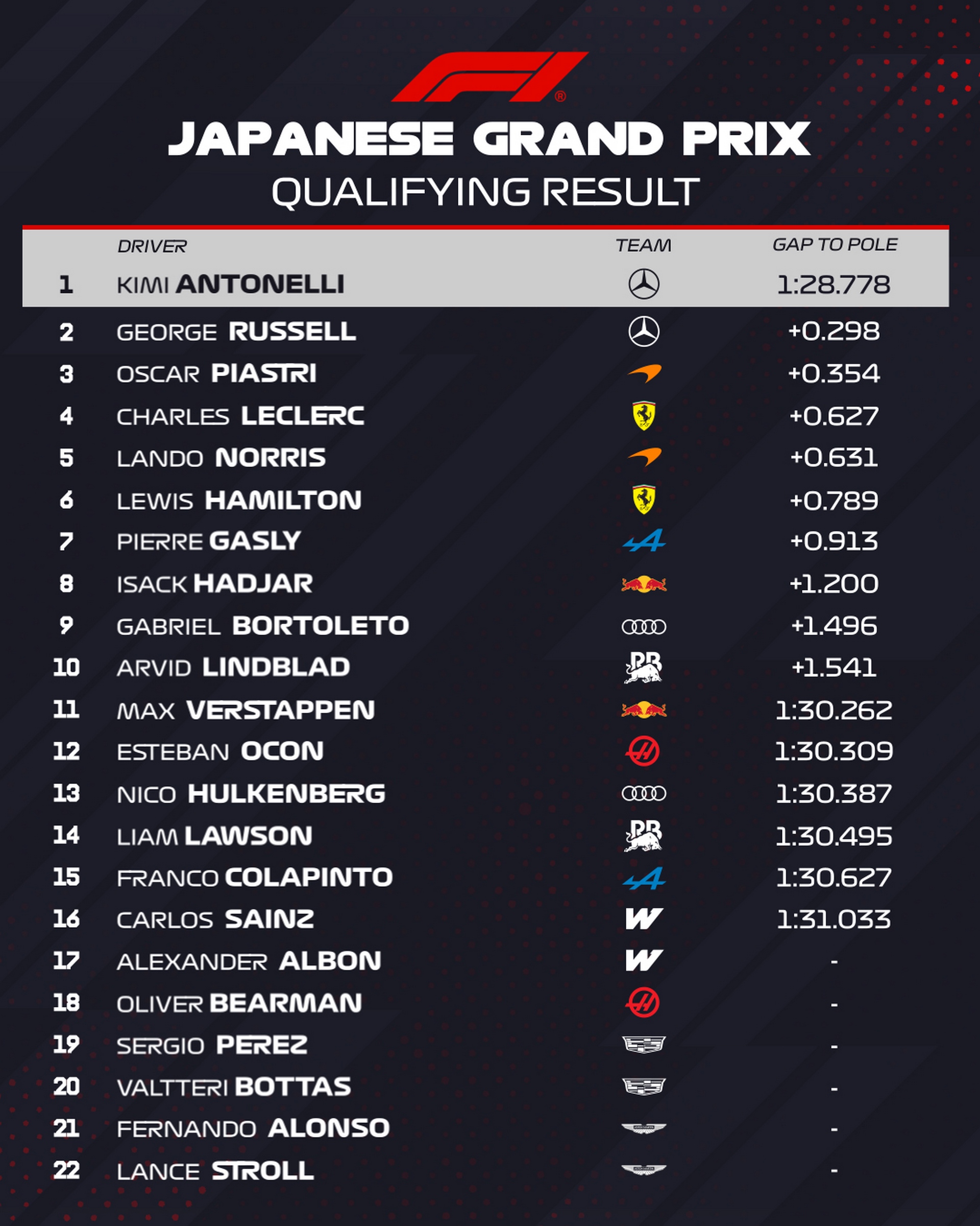 L'heure des qualifications du Grand Prix du Japon a permis à Kimi Antonelli de signer le meilleur chrono et sa deuxième pole position de rang, Mercedes verrouille la première ligne.