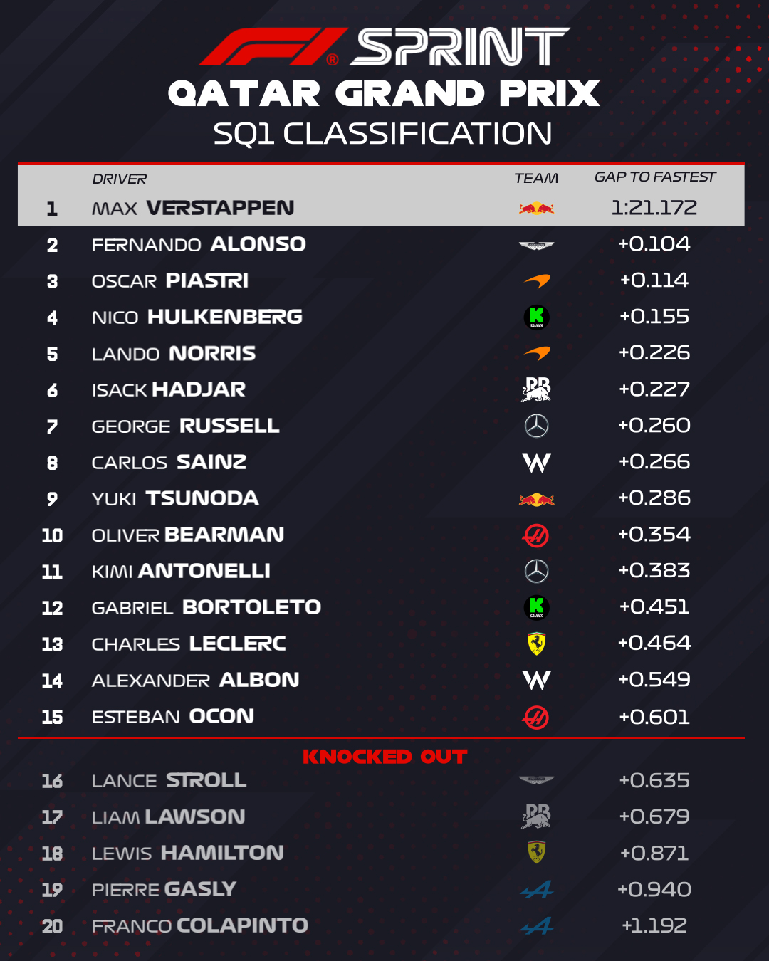 Les éliminés sont : Hadjar, Bearman, Bortoleto, Hülkenberg et Ocon.