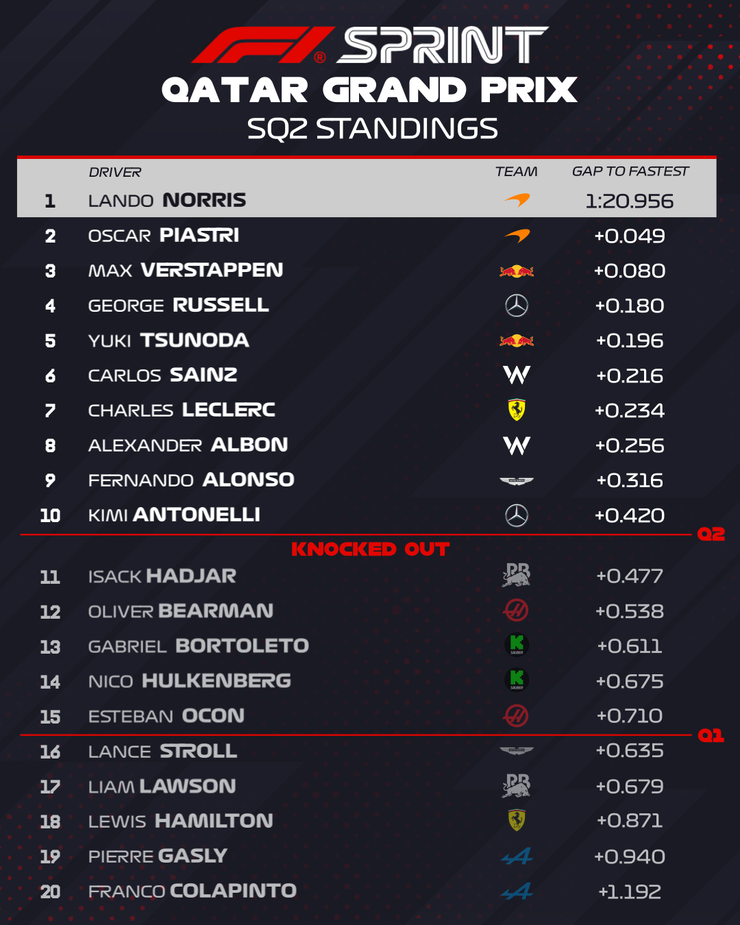 A nouveau les pneus Medium pour cette session, avec une piste qui va offrir un peu plus d'adhérence. Verstappen se relance très tôt à l'assaut du chrono, il coupe la ligne en 1'21"295, légèrement moins rapide qu'en SQ1, Leclerc échoue à 0"196 derrière la Red Bull, Norris parvient à améliorer en 1'20"956 plus de 3 dixièmes de mieux que Verstappen, Piastri s'approche de son coéquipier à 0"049, et Russell s'intercale entre les McLaren et Verstappen, alors qu'Antonelli doit s'y reprendre à deux fois pour inscrire un premier chrono à moins de 5 dixièmes au 7e rang.