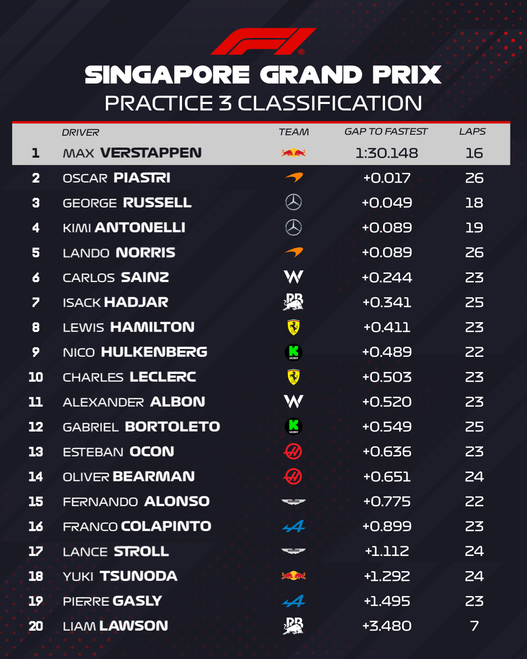 Dans les dernières secondes de la séance, Antonelli revient au 3e rang à 0"089 du chrono de la Red Bull. Piastri attend le tout dernier moment pour déclencher son chrono, pour son tour rapide mais échoue à 0"017 du Batave ! Verstappen en candidat surprise conserve son meilleur temps devant Piastri, Russell, Antonelli, Norris, Sainz, Hadjar, Hamilton, Hülkenberg et Leclerc pour le Top 10.