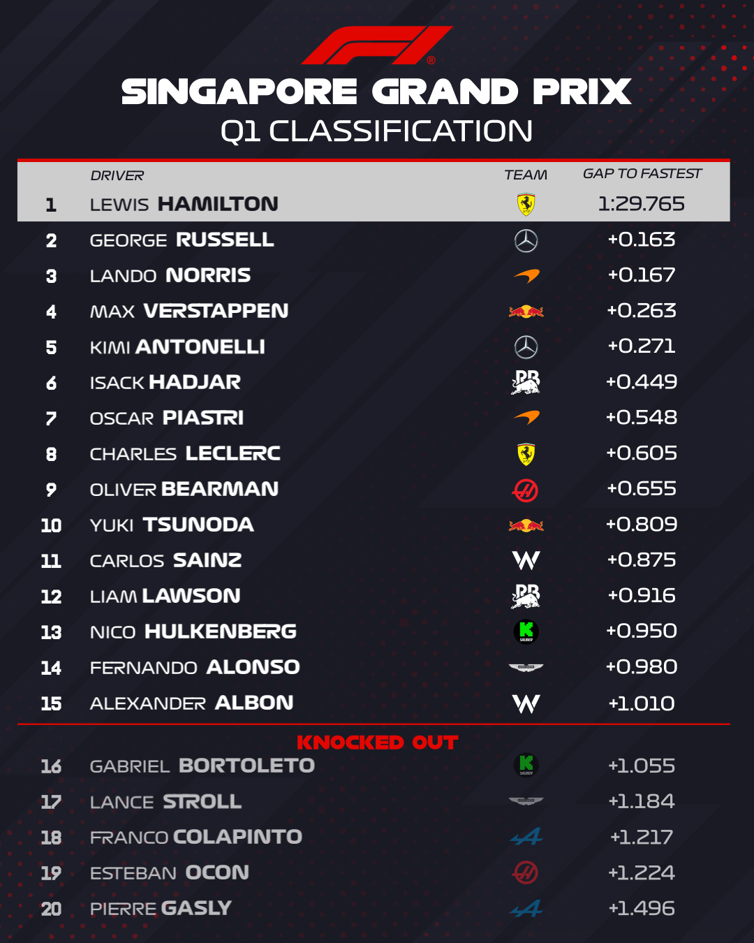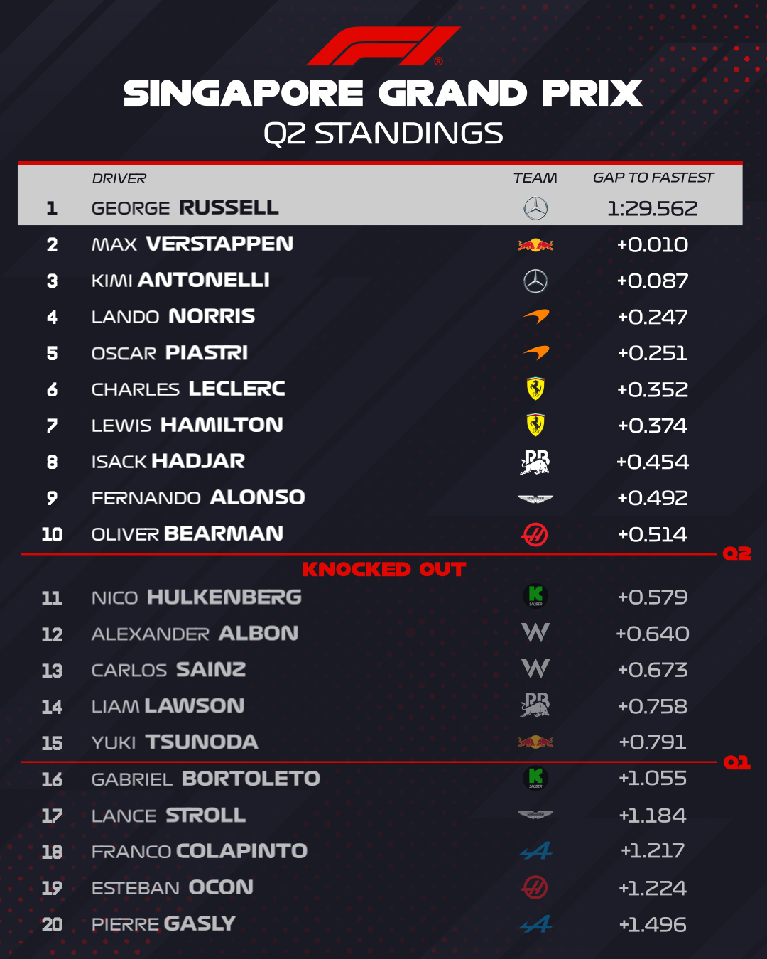 Les éliminés sont : Gasly, Ocon, Colapinto, Stroll et Bortoleto.