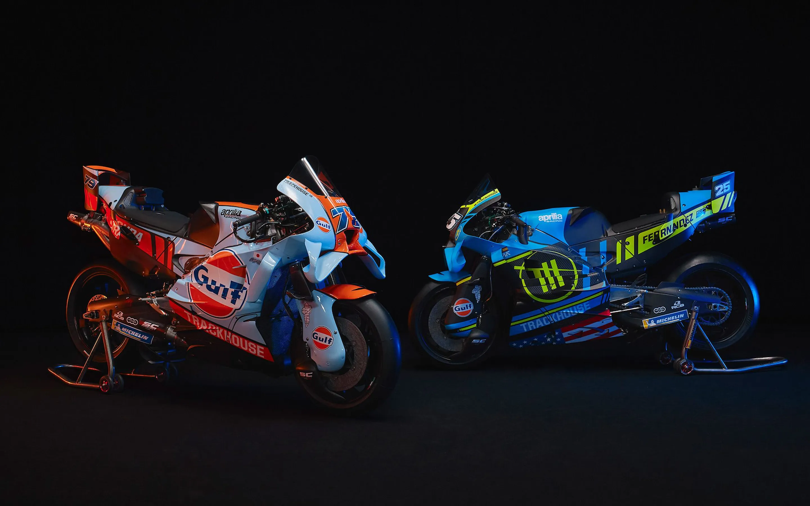 Trackhouse a présenté deux versions de l'Aprilia pour la saison 2026 : une avec les couleurs emblématiques de l'équipe et une avec une livrée aux couleurs de Gulf.