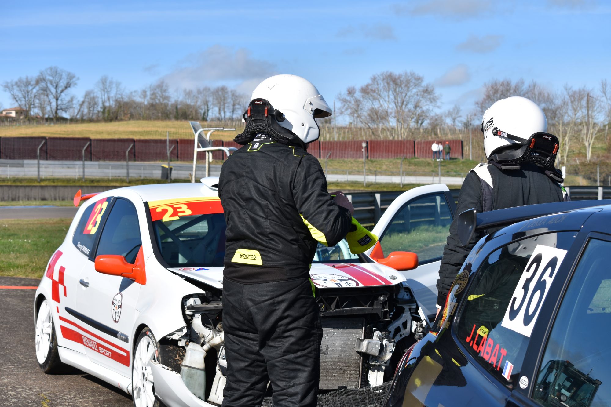 Le départ a été agité. Thierry Carrouée s'est fait tasser dans l'herbe, il s'est un peu précipité pour revenir en piste, et s'est fait percuter par l'infortuné Jacques Labat. La course s'est arrêtée là pour les deux pilotes de Clio 3 Cup et l'incident s'est clôt par des excuses et une franche poignée de mains. Le bel esprit de la Coupe de France des Circuits !