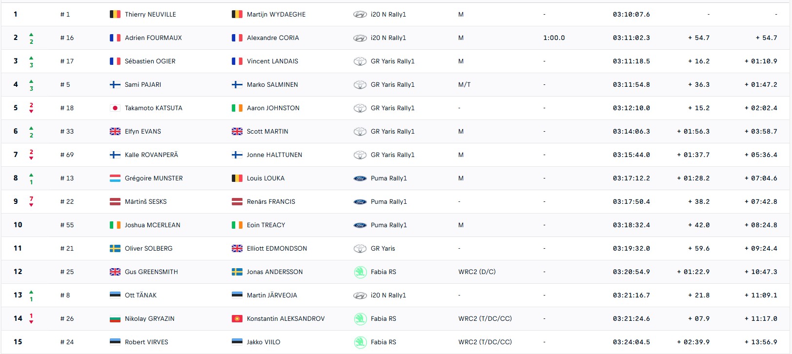 Avant l'ultime spéciale de la journée, Neuville pointe en tête au général pour 54"7 sur Fourmaux et 1'10"9 sur Ogier désormais 3e. Pajari est 4e à 37 secondes derrière Ogier, Katsuta chute au 5e rang après son tonneau, Evans remonte à la 6e place mais pointe presque à 4 minutes du général, Rovanperä est 7e à 5'36 de l'homme de tête, Sesks qui espérer se mêler à la lutte pour la victoire a perdu très gros, il est 9e à 7'42 ! Deux autres attributions de points viendront, le Super Sunday (disputé ce samedi), où Neuville mène pour 1"5 sur Ogier et 9"5 sur Evans, puis les points du classement de la Power Stage, sauf catastrophe, Ogier est en route pour son 9e titre !