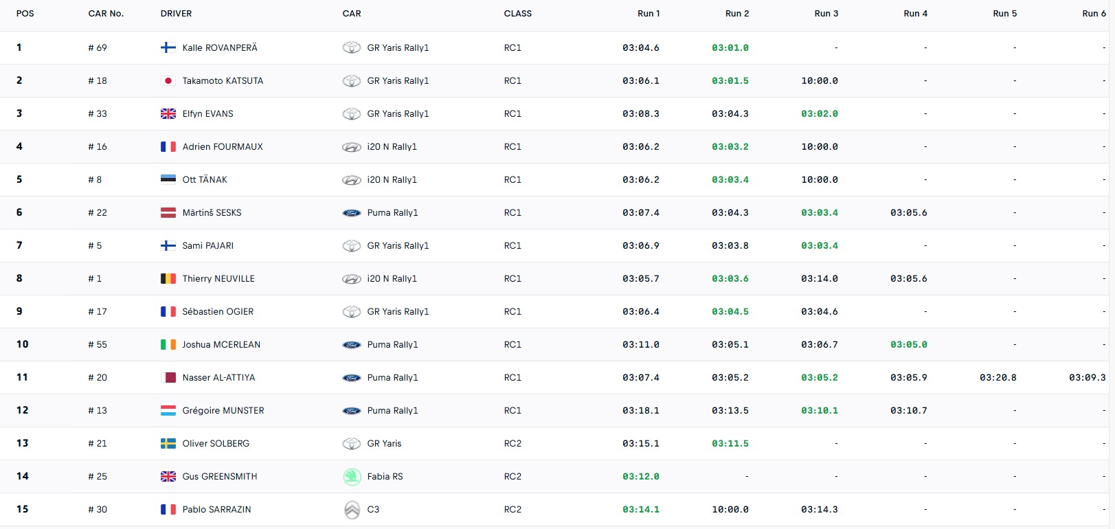 Pour ce qui sera sa dernière apparition en WRC, Rovanperä a trouvé un équilibre précoce entre attaque et prudence sur un terrain qu’il décrit comme « rempli de pierres », et appelé à changer fortement au fil du week-end. Pour son tout dernier rallye, l'équipe Toyota a tenu a rendre un hommage à son pilote finlandais en inscrivant sur le toit de sa voiture, tous les noms des membres de l'équipe Toyota Gazoo Racing WRT.
