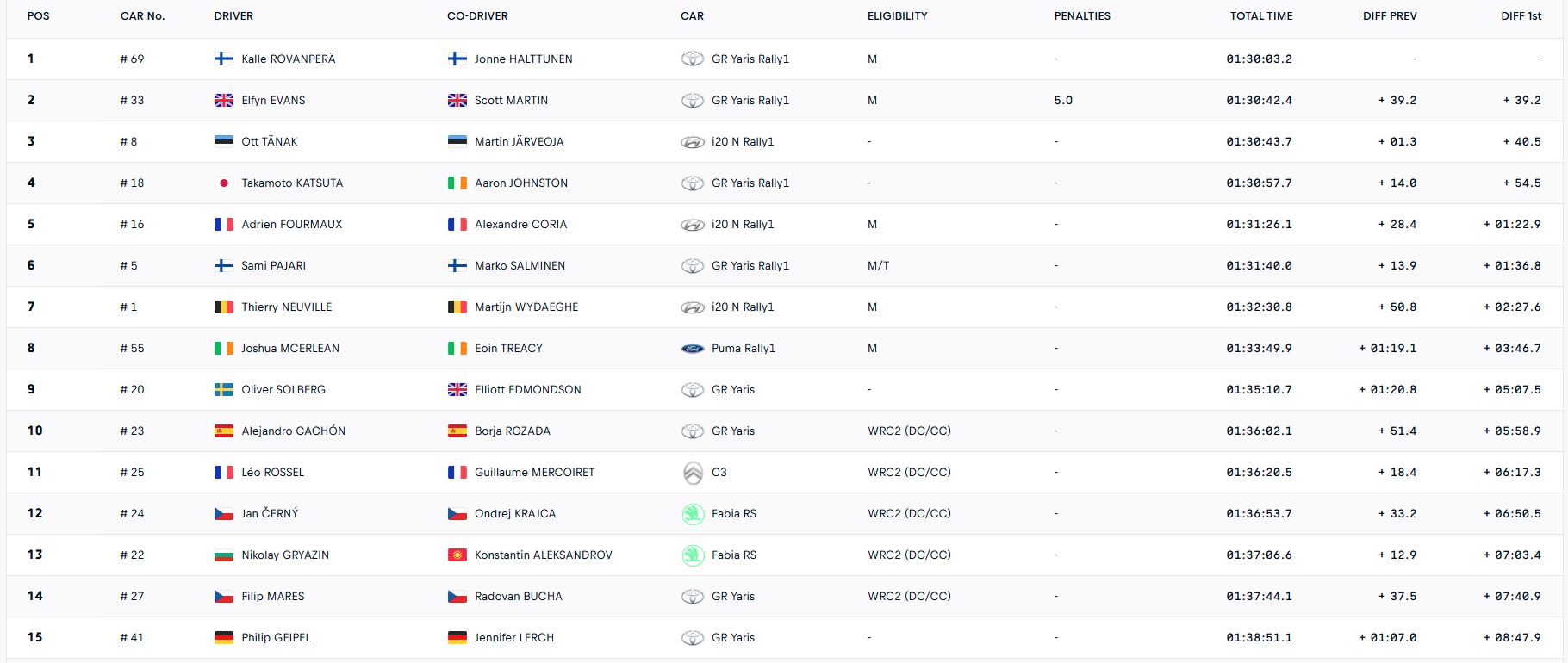 L’épisode, presque identique à celui vécu au même endroit l’an passé, laisse Rovanperä seul maître à bord. Le Finlandais a remporté la spéciale longue de 21,95 km avec 6,4 secondes d’avance sur Elfyn Evans, portant ainsi son avantage global à 38,4 secondes. Avant le départ de l'étape, Ogier ne comptait que sept dixièmes de retard, après avoir perdu son leadership — acquis la veille pour six dixièmes — sur la spéciale précédente.