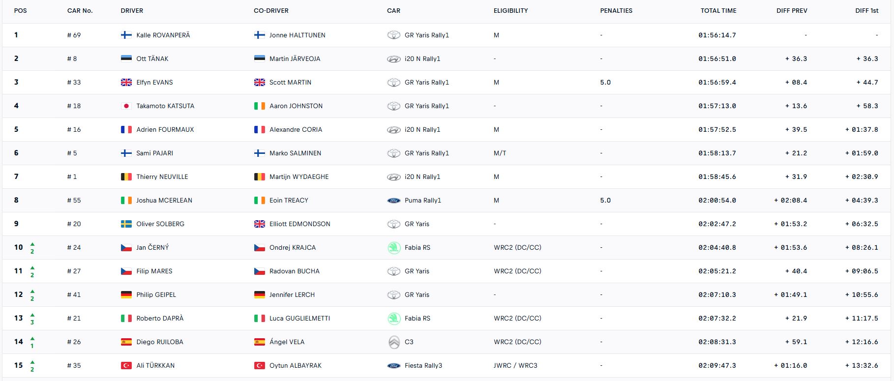 Derrière lui, Ott Tänak s’est révélé comme son plus proche adversaire. Auteur du meilleur temps dans la deuxième boucle de Keplý, le pilote Hyundai a doublé Evans pour s’emparer de la deuxième place, malgré un problème de transmission inquiétant. Il termine la journée à 36,3 secondes du leader.
