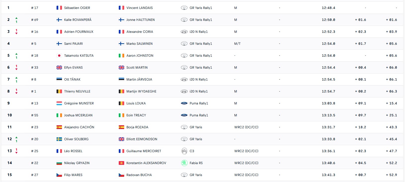 Grégoire Munster et Josh McErlean complétaient le top 10 pour M-Sport Ford. En WRC2, Alejandro Cachón menait les débats avec sa Citroën C3 Rally2, devant Oliver Solberg et Léo Rossel.