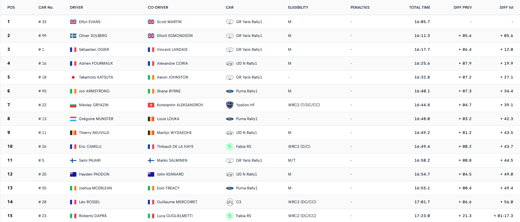 Adrien Fourmaux parvient à signer un chrono correct et se classe pour le moment quatrième. Côté Ford, Jon Armstrong surprend en signant le sixième chrono. L'Irlandais est le meilleur des trois pilotes Ford sur cette première spéciale ! Sami Pajari, Hayden Paddon et Josh McErlean se montrent les plus en difficulté sur cette spéciale d'ouverture avec un chrono qui les relèguent déjà à presque une minute du leader Elfyn Evans.