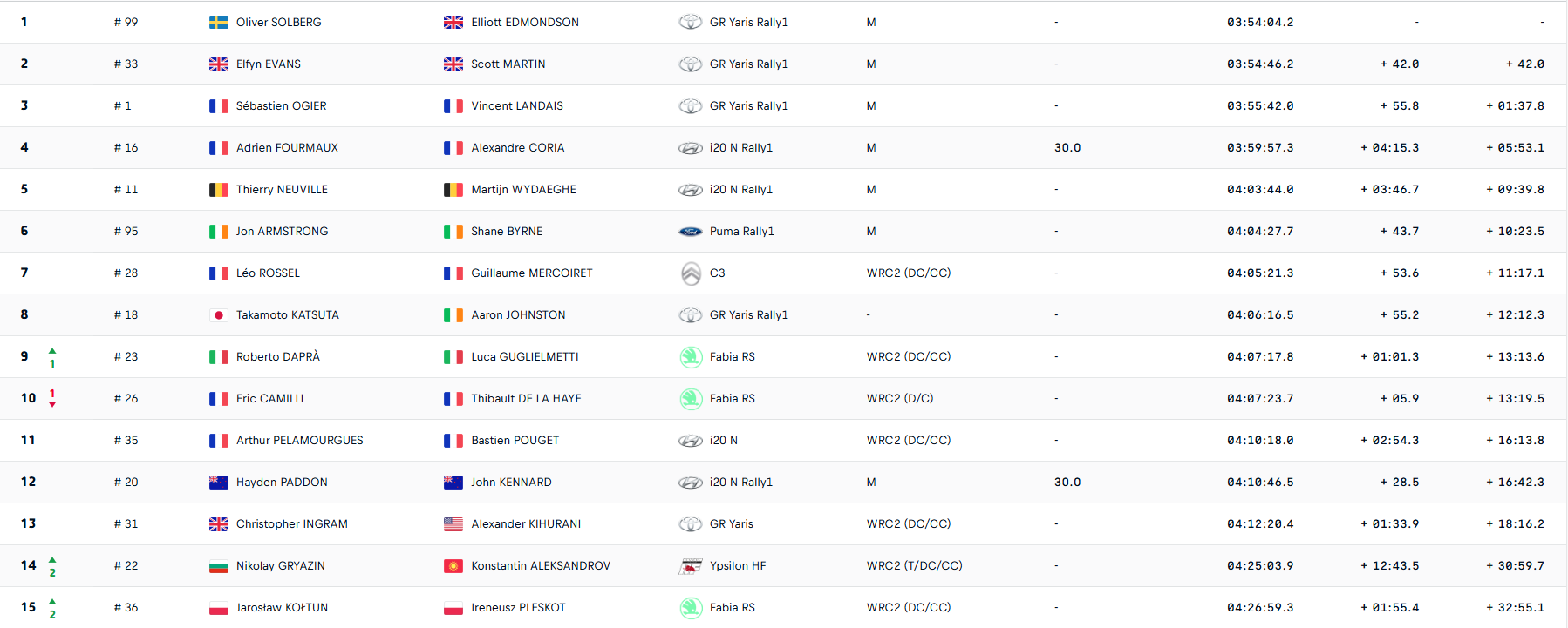 En WRC2 , Léo Rossel poursuit son raid solitaire en tête. Intouchable au volant de sa C3 Rally2, le Champion de France 2024 vole sur la glace et frôle désormais les deux minutes d'avance sur Roberto Dapra. Au volant de la Lancia Ypsilon, son frère Yohan revient fort, puisqu'en signant les deux meilleurs temps sur ces deux spéciales, il s'assure de sauver quelques points grâce au super sunday.