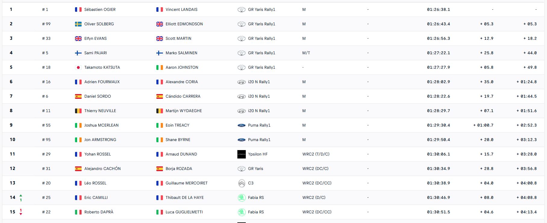 Sami Pajari concède 6,1 secondes à Katsuta. L'écart entre les deux hommes pour la 4ème place du général fond et n'est plus que de 6,5 secondes ! Solberg perd 2,5 secondes sur Evans ! Cela signifie que l'avantage de Solberg sur Evans pour la 2ème place n'est plus que de 4,9 secondes. Le leader du rallye perd 4,4 secondes sur Evans et 1,9 seconde sur Solberg ! L'avance du nonuple champion du monde est désormais réduite à 5,4 secondes sur Solberg. Evans, en 3ème position, n'est plus qu'à 10,3 secondes de la tête. « J'ai joué la sécurité. Il est clair qu'il était possible d'aller plus vite. »