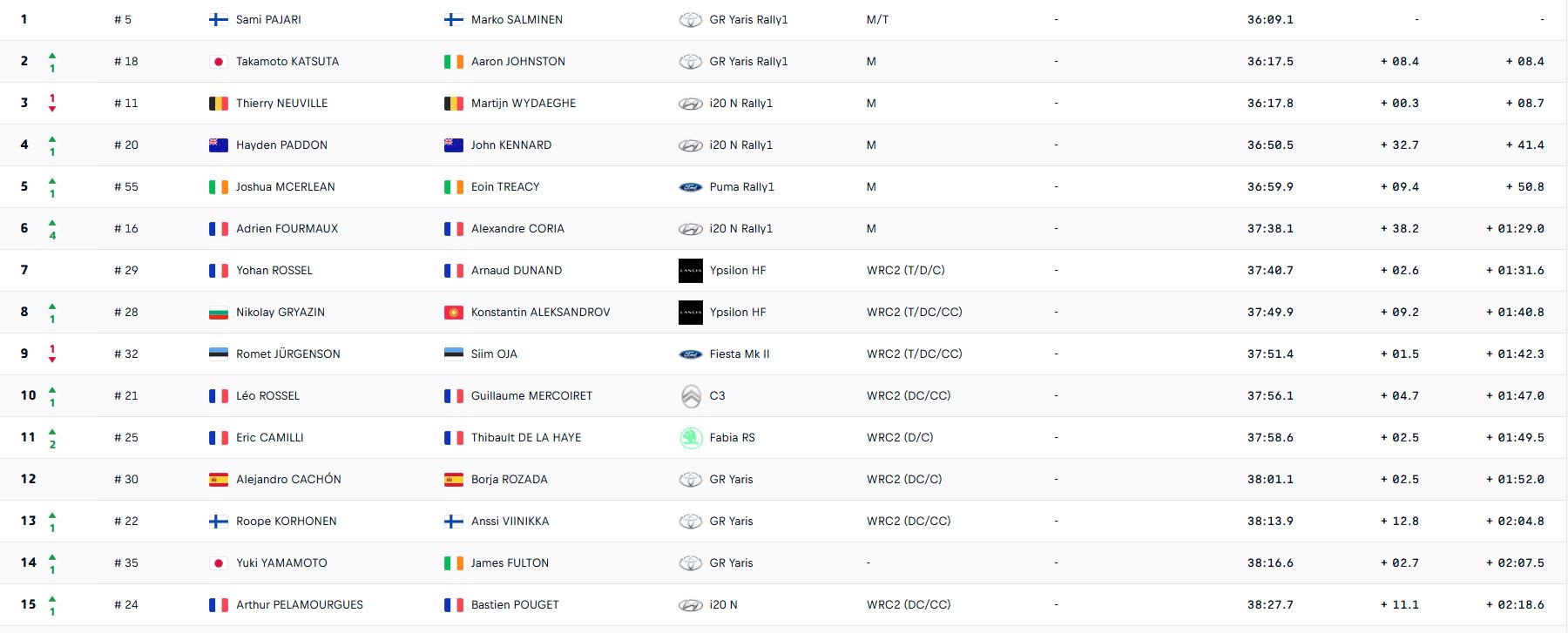 Pendant que les favoris tombaient les uns après les autres, Pajari a gardé son calme. Deuxième sur les deux premières spéciales, il a profité de la sortie d’Evans pour s’emparer de la tête, avant de signer le scratch l'ES4 pour creuser l’écart. « Ce n’était pas la position que j’attendais après la première boucle, mais je ne vais pas m’en plaindre », souriait le Finlandais. « Je peux encore progresser sur les autres spéciales. Ce n’est pas facile, mais nous avions un bon plan avec les pneus durs. »