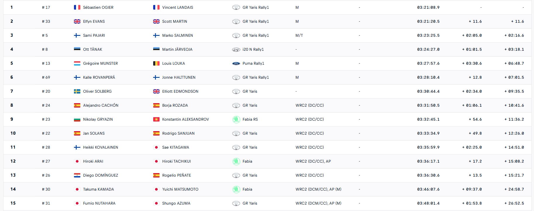 Derrière, Pajari a signé une performance exemplaire pour monter sur la troisième marche du podium. Ott Tänak, malgré une crevaison matinale, a remporté la spéciale SS15 et conservé la quatrième place. Grégoire Munster a égalé son meilleur résultat en terminant cinquième, juste devant Rovanperä, brillant revenant après ses ennuis de suspension du vendredi.