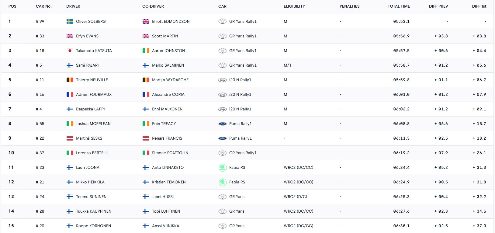 Le leader du championnat a signé un 5'53"1 sur les 10,23 km du tracé, menant un impressionnant tir groupé d'un quatuor pour Toyota Gazoo Racing. Elfyn Evans s’est accroché à 3"8, tandis que Takamoto Katsuta et Sami Pajari complétaient le quatuor.